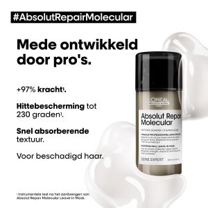 Ontdek het geheim achter prachtig hersteld haar met L’Oréal Professionnel Absolut Repair Molecular Leave-in Mask! Heeft jouw haar te lijden gehad onder talloze stylingssessies, hittebehandelingen en andere dagelijkse stressfactoren? Geen zorgen meer! Dit professionele leave-in masker, geformuleerd met krachtige Peptiden bonder en 5 essentiële aminozuren, biedt de ultieme oplossing om de gezondheid van beschadigd haar te herstellen.