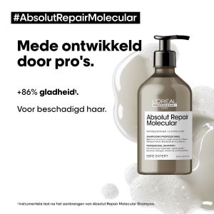Ontdek de ultieme verzorging voor beschadigd haar met L'Oréal Professionnel Absolut Repair Molecular Shampoo! Is het haar beschadigd door styling, hitte of andere dagelijkse stressfactoren? Dan is deze professionele shampoo de perfecte keuze. Deze geavanceerde formule is verrijkt met krachtige Peptiden bonder en 5 essentiële aminozuren om de macromoleculaire structuur van het haar te herstellen.